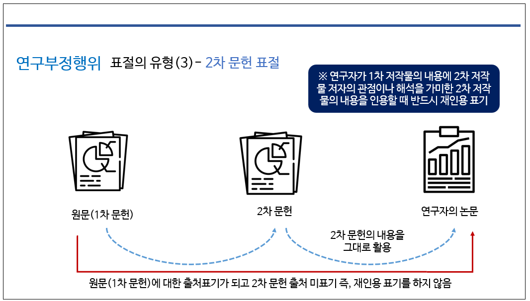 - 표절: 일반적 지식이 아닌 타인의 저작물 또는 아이디어를 적절한 출처 표시 없이 사용하는 행위