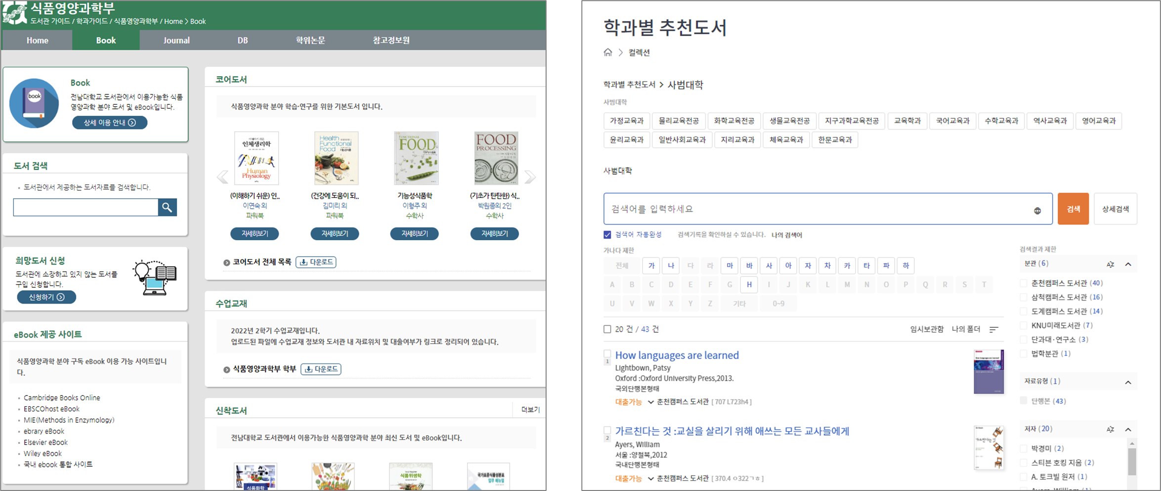 예시와 같이 학문 주제별, 학과별 다양한 도서를 안내하고 있다.