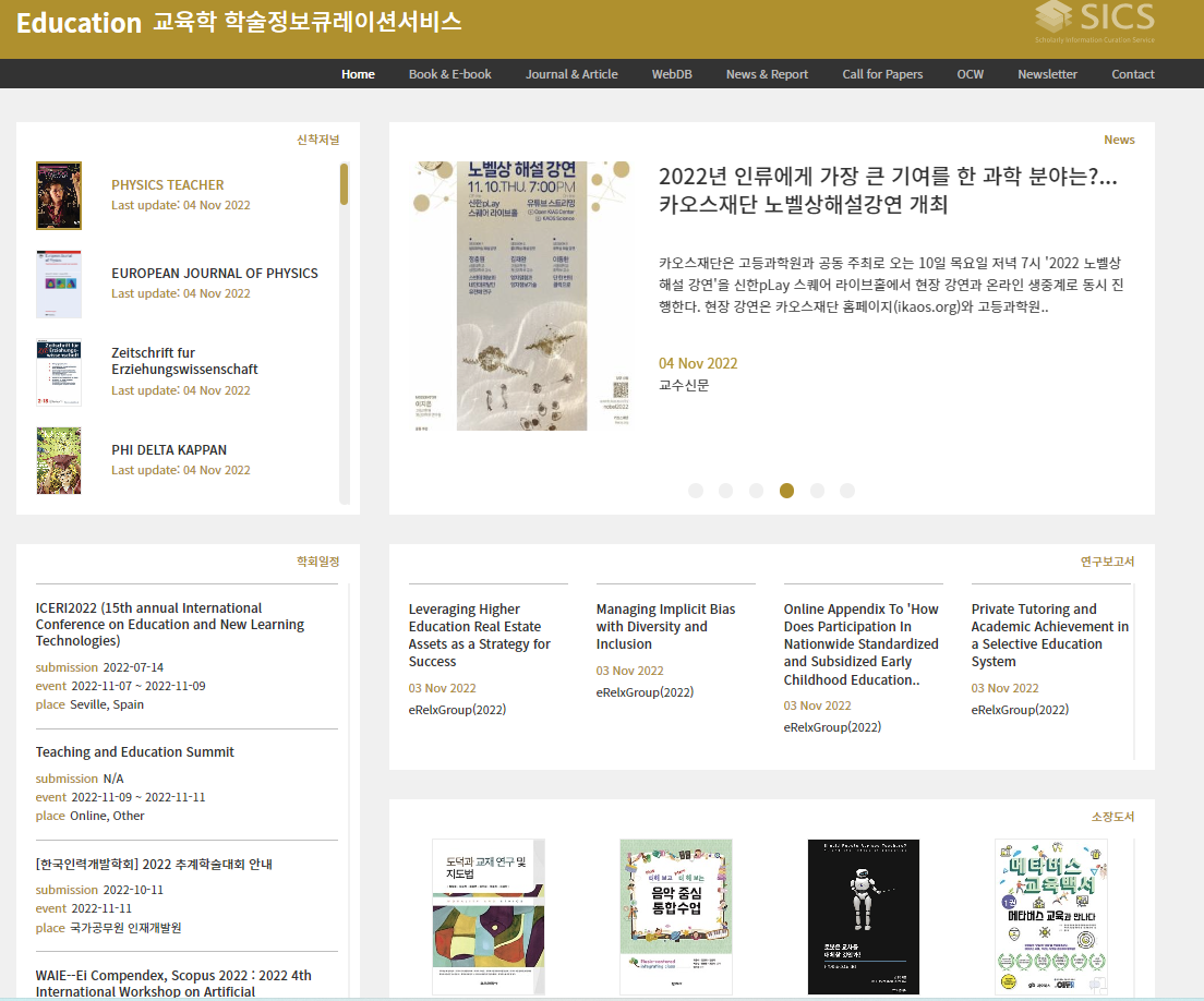 고려대 도서관에서 제공하는 SICS에는 해당 학문의 최신 자료(신착자료/소장자료) 및 구독자료(전자저널/Web DB) - 주요 등재저널 포함, 학회일정, 공개 강좌 등을 제공하고 있다.