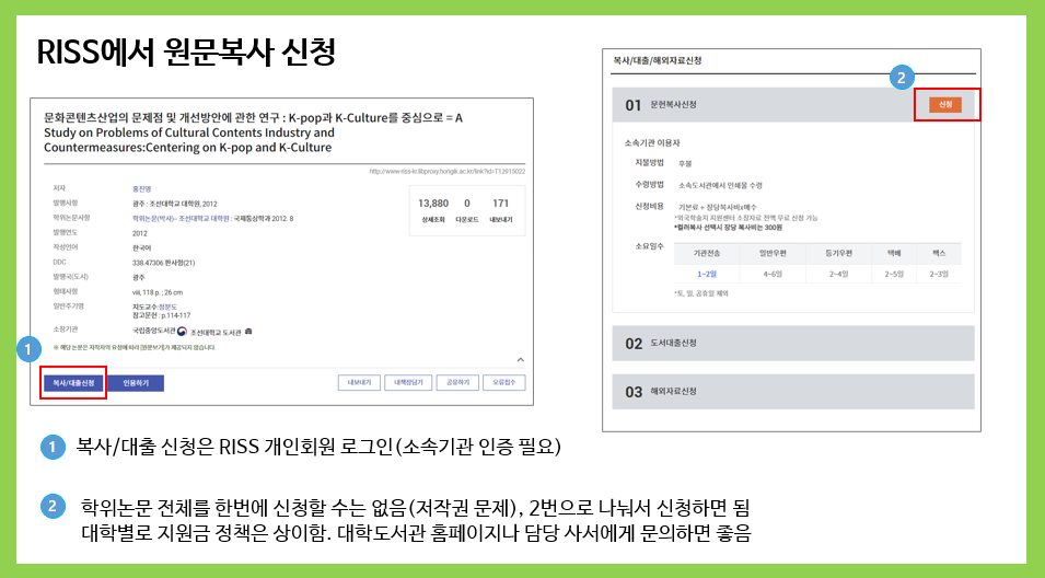 국내 대학 구성원(학부생, 대학원생, 교직원)이라면, RISS 플랫폼을 통해 미소장 자원에 대한 상호대차, 원문복사 신청이 가능하다.