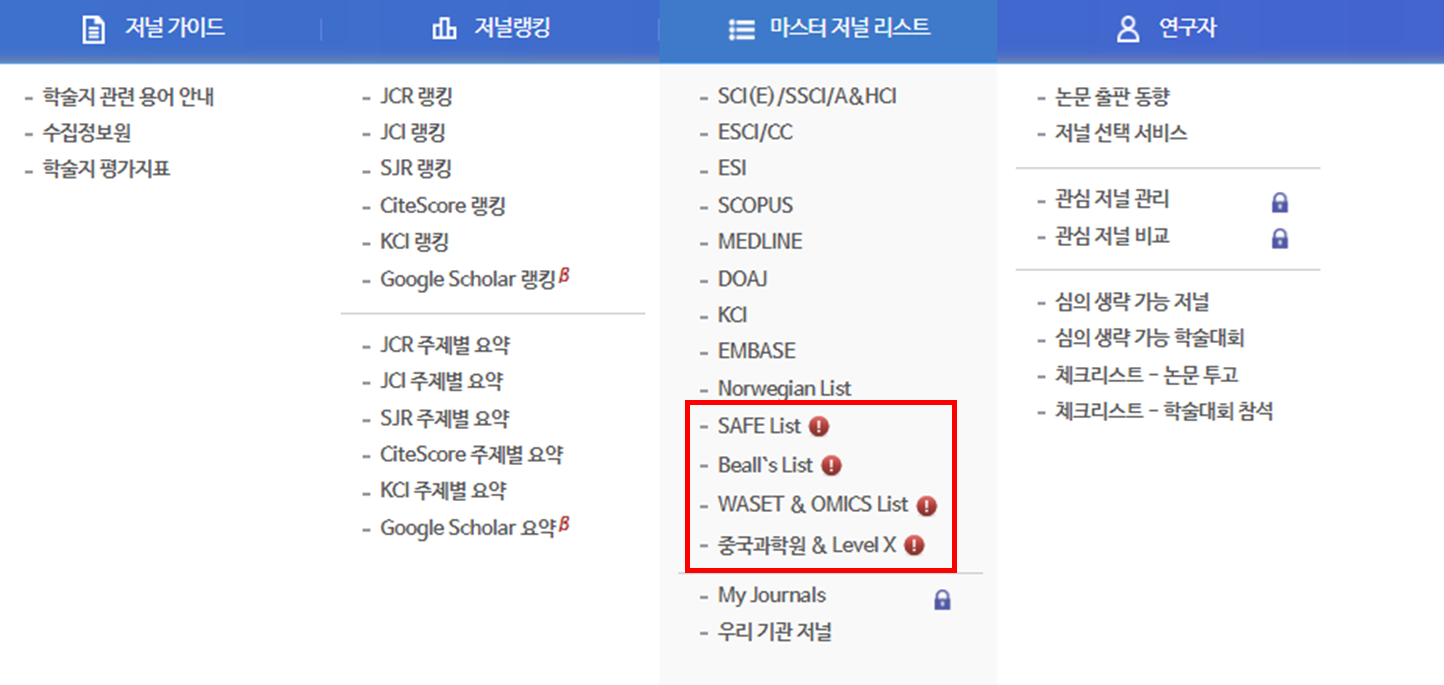 - Open Access Journal 확인 및 Fake Open Access Journal 확인으로 연구자의 잘못된 논문 투고 방지