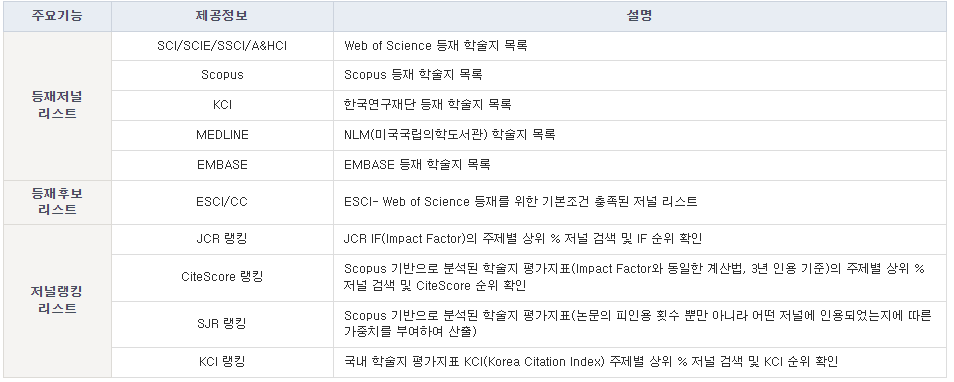 - 연구 성과를 평가하는 JCR, SJR, KCI 등 다양한 저널지표 등을 효율적으로 검색