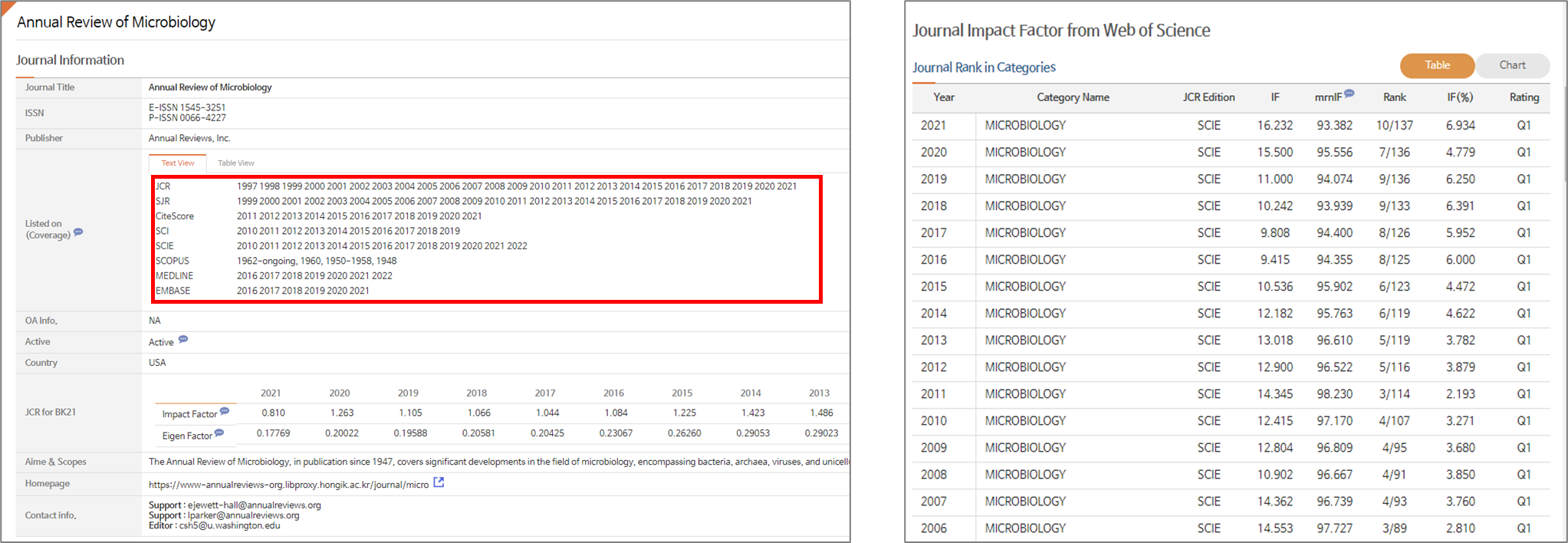 예시에 제시된 Annual Review of Microniology는 2010년 부터 SCI에 등재되었으며, 1962년부터 현재까지 SCOPUS에 등재 되었다고 나온다. 연도별 JCR IF, SCOPUS Citescore 정보까지 제공된다.