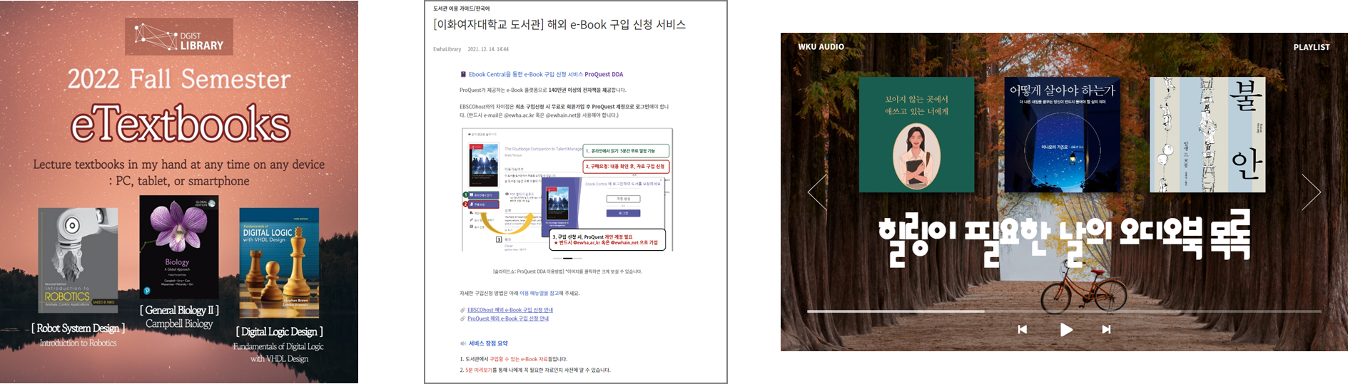 - 전자책을 활용한 서비스 활성화는 이용자들에게 도서관 소장, 구독자원의 접근성을 높여준다. 또한 오디오북, 전자책 이벤트를 통해 도서관의 끊긴 발길을 다시 불러 올 수도 있다.