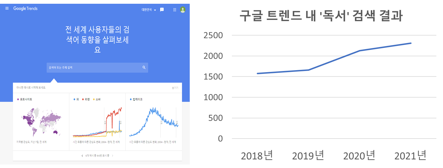 하지만 다른 측면에서 살펴보면, 구글 트랜드 분석에서 '독서'라는 키워드는 지속적으로 증가하고 있고, SNS와 유튜브에서 독서는 인기 컨텐츠로 자리잡고 있다.