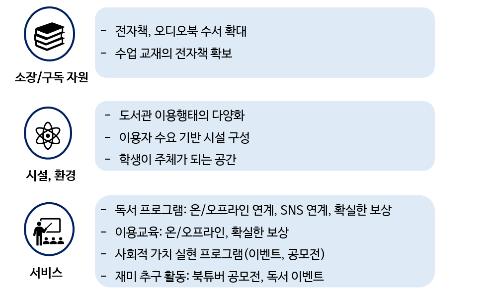 ① 소장/구독자원: 전자책 서비스/오디오북 활성화, 다양한 수서 모델 적용