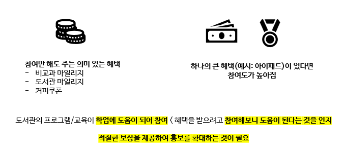 우리가 아무리 도서관, 독서, 도서관 프로그램, 도서관 교육이 학습에 도움이 된다고 말해도 이해하지 못한다. 그보다 더 좋은 것들이 많기 때문이다. 적당한 혜택과 보상을 주면서 도서관에 오겠금, 도서를 대출하겠금, 도서관 프로그램(교육/행사)에 참여하겠금 해보면 좋지 않을까?