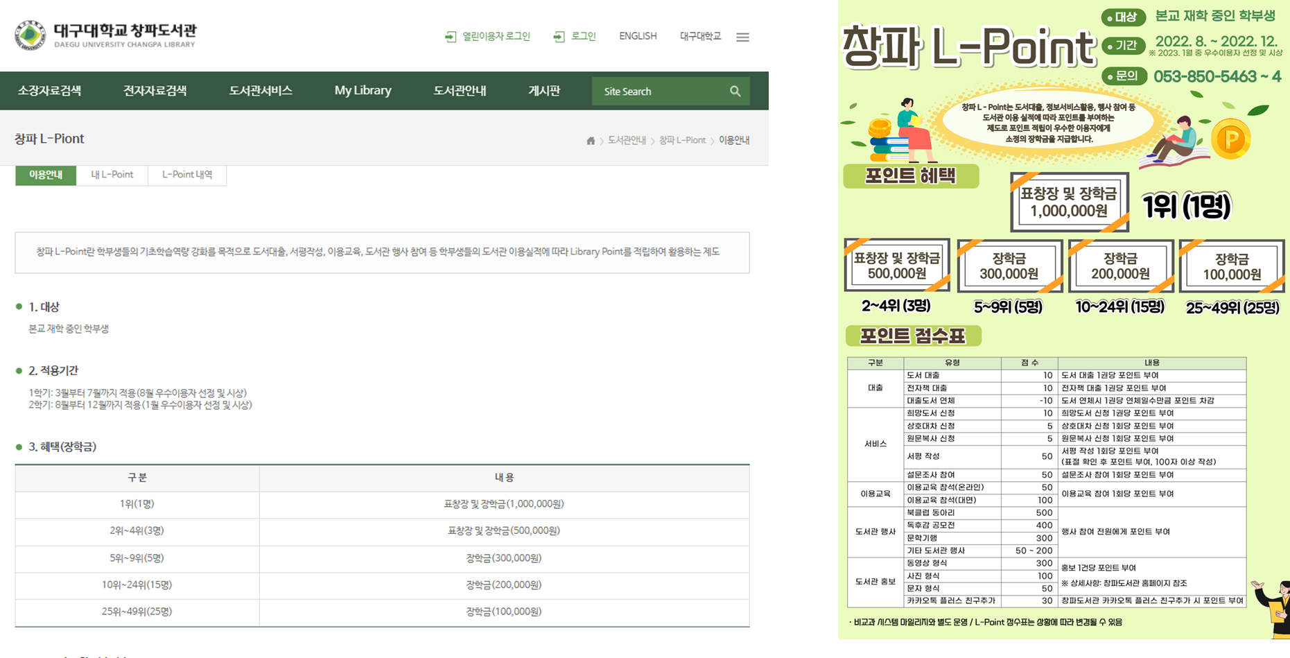 대출/서비스/시설이용/이용교육/행사참여/도서관 홍보 등의 항목으로 나눠서 점수을 얻을 수 있고, 1위 ~ 25위까지 선발한다. 1위~4위까지는 표창장과 장학금이 제공되고, 1등 장학금은 무려 100만원이다.