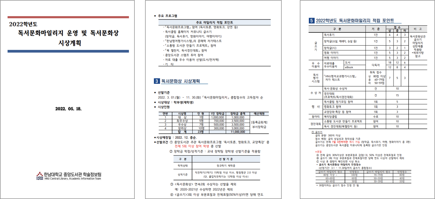 한남대 도서관은 매 학년도 독서 문화마일리지를 운영하여 독서문화상을 시상하고 있다. 글쓰기, 다대출자, 독서 평가시스템 등 다양한 독서 활동을 통해 포인트를 얻을 수 있고, 이를 바탕으로 장학금을 제공하는데 여기도 1등이 무려 100만원이다.