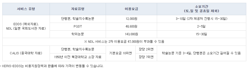 위 화면처럼 일본/중국/유럽권 자료를 검색하여 복사신청을 하면 신청자의 소속대학도서관으로 배송되어 자료를 받아볼 수 있다. 비용은 아래와 같다(홍익대 중앙도서관 홈페이지 참조)