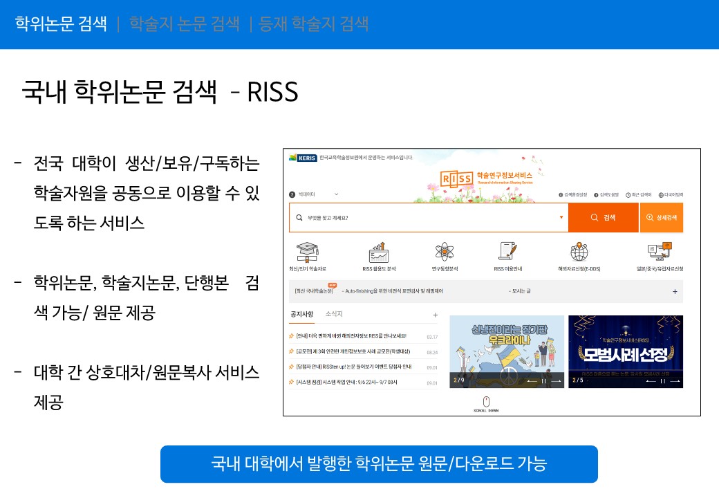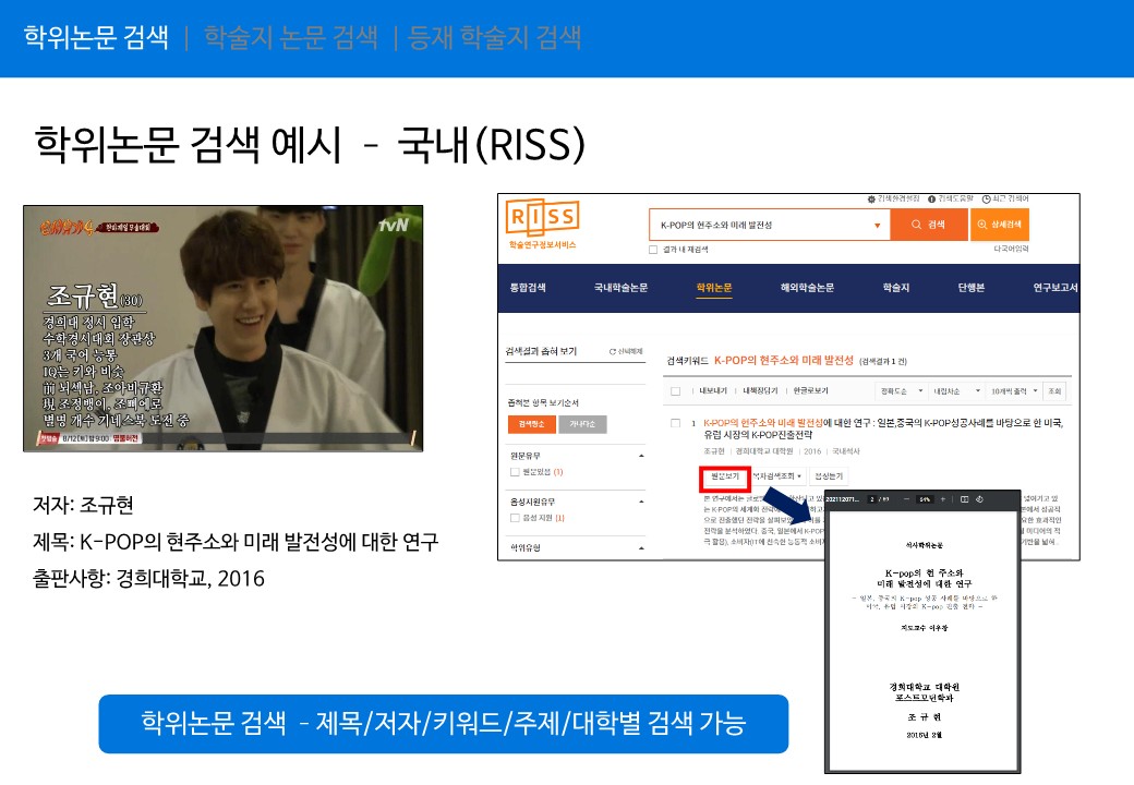 국내 학위논문은 RISS를 통해서 검색할 수 있다. RISS는 전국의 대학에서 발행된 학위논문을 볼 수 있다. 예시에 나온 것은 슈퍼주니어 규현님의 논문인데, 한때 많은 팬들이 원문을 열람해서 가장 많이 읽어본 논문 TOP에도 들었다고 한다.